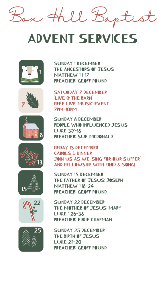 Friday December 13 – Dinner and Carols @ the Barn – 6pm start as we share in a time of food and festive songs – Please bring a dish to share!