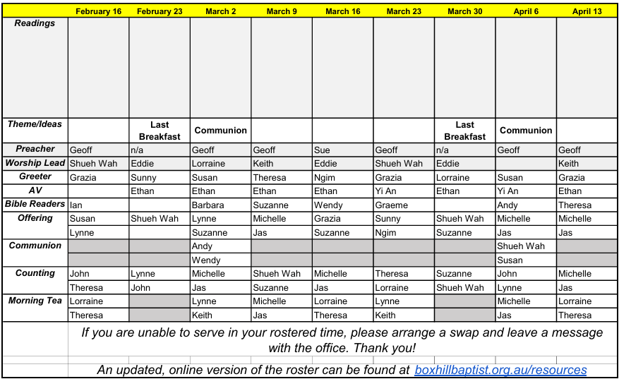 + If you would like the opportunity to ‘walk through’ the new constitution, or if you are new to the Baptist denomination and would like to gain a better understanding of the way Baptist decision making works, there will be an information session after church Sunday, March 23 (provided there is sufficient interest).